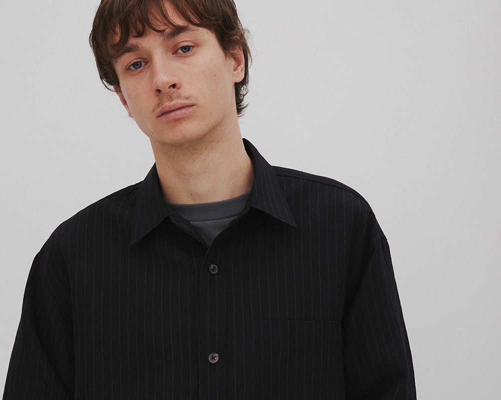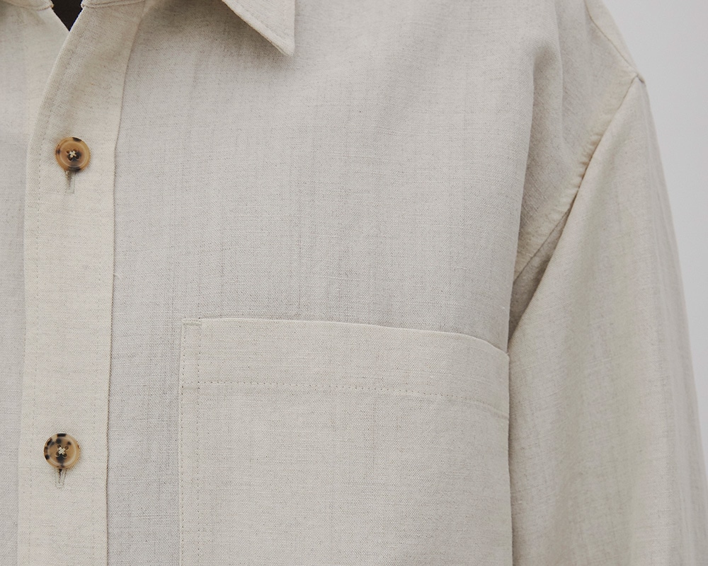 ドロップショルダーと背面タックが自然な膨らみを生み、ラウンドヘムにより一枚でも羽織でも様になる設計です。台襟付きのシャツカラー、袖口はカフス仕様。胸にはパッチポケットを配置。