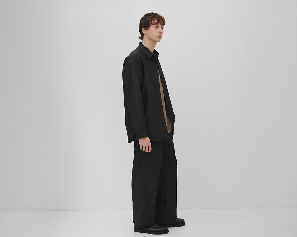 一枚でも羽織でも様になり、同素材トラウザーと合わせればセットアップとしても成立するシャツです。