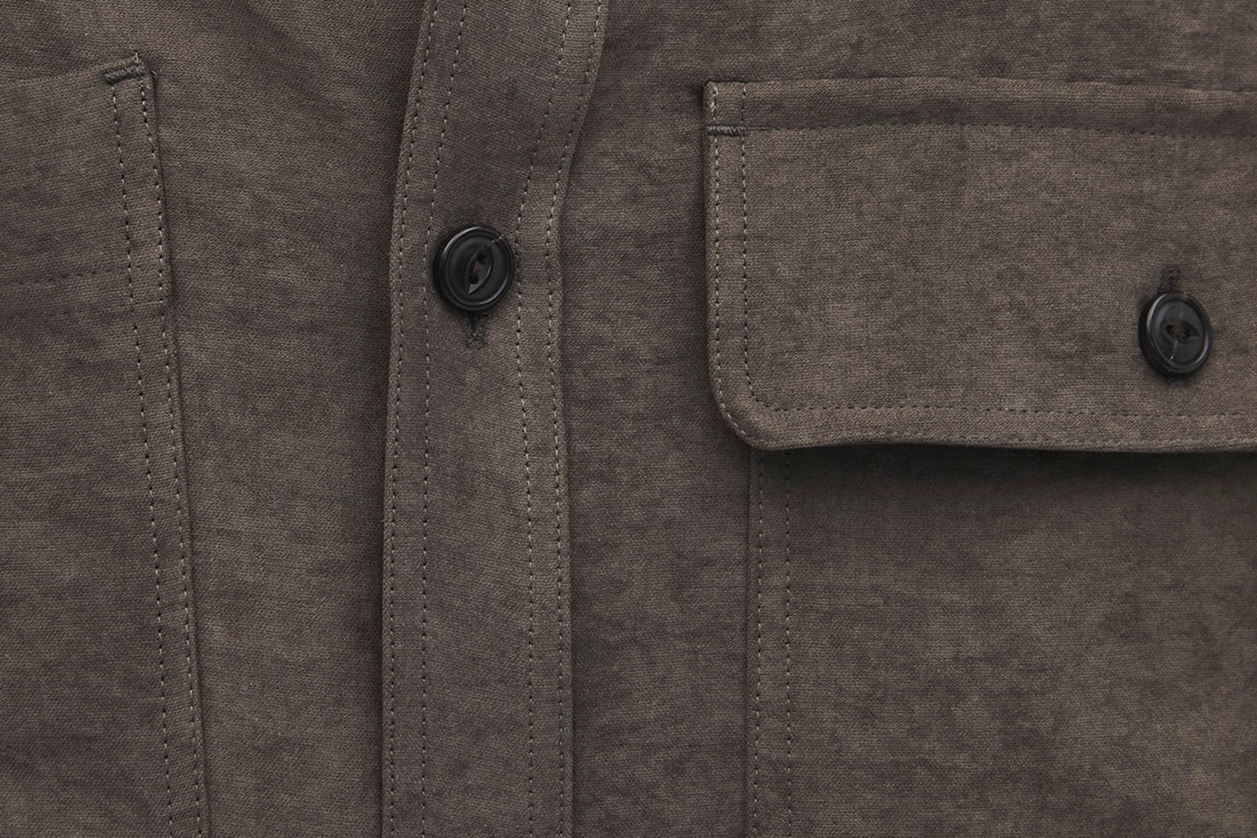 猫目の水牛釦やダブルステッチなど、クラシックなディテールを随所に取り入れています。シャツとしての軽さと、アウターとしての存在感を併せ持ち、季節の変わり目には主役として、冬場はインナーとしても活躍。