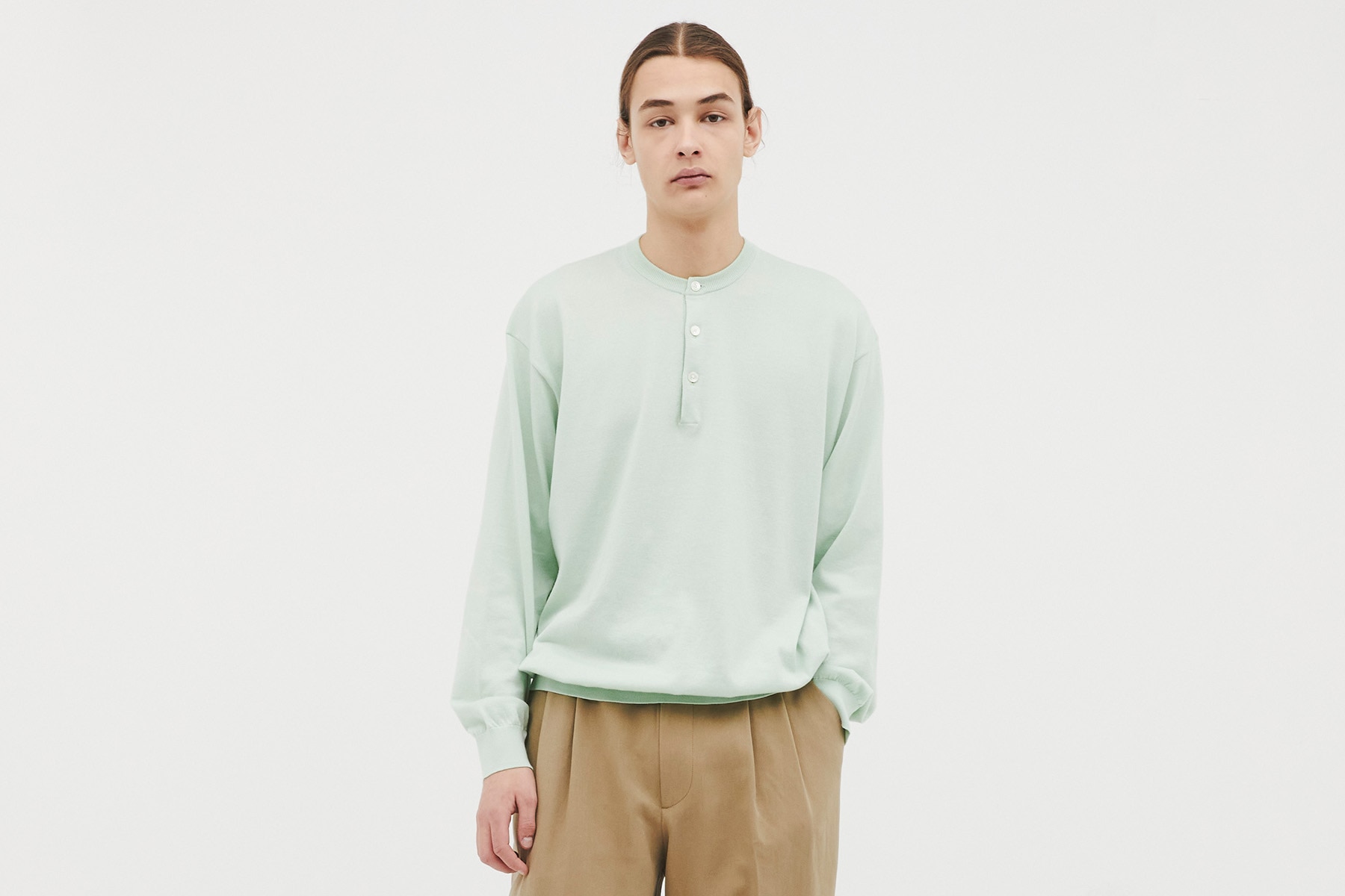 袖口と裾口にリブを配し、全体を丸みのあるフォルムに整えています。さり気ないヘンリーネックディテールがポイント。