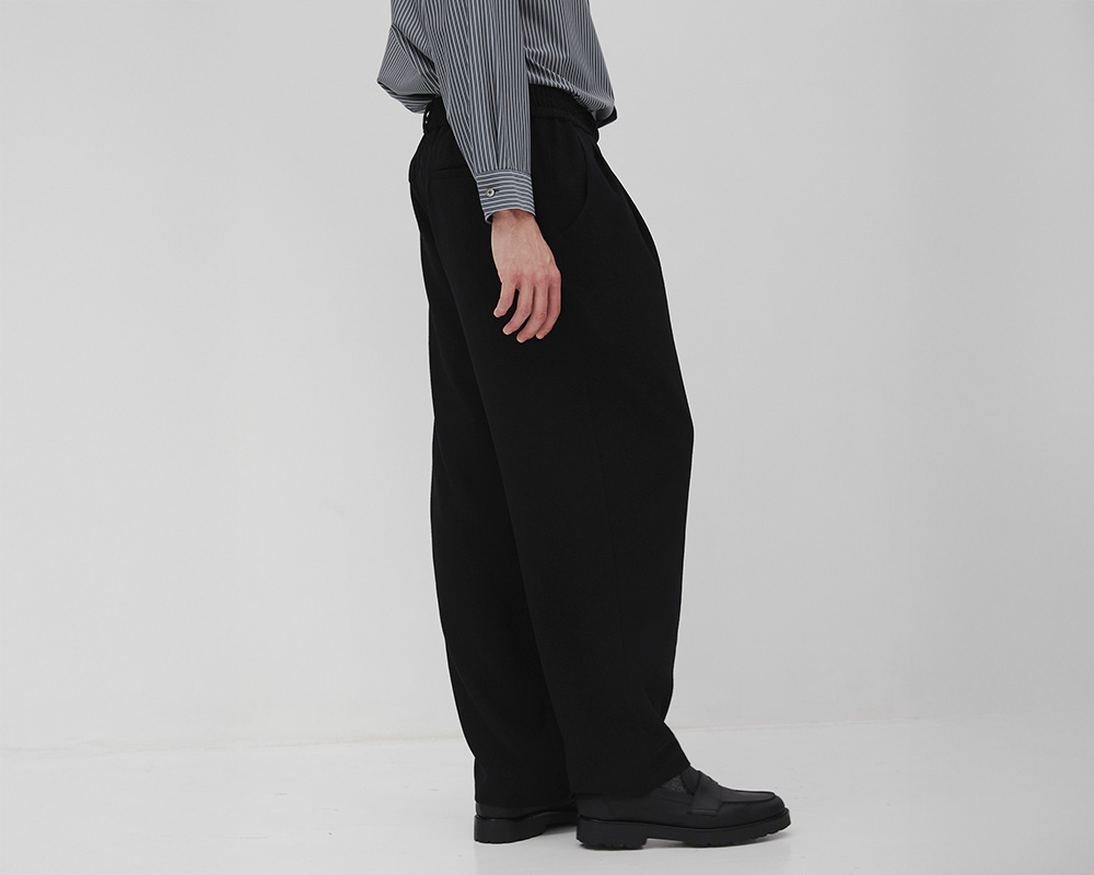 丈感はウエスト位置の調整で印象を変えられます。イージーパンツでありながら、上品な素材感により革靴でもスニーカーでも好相性。