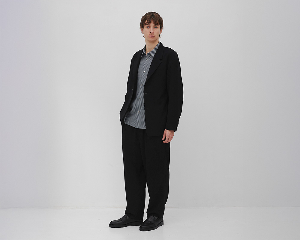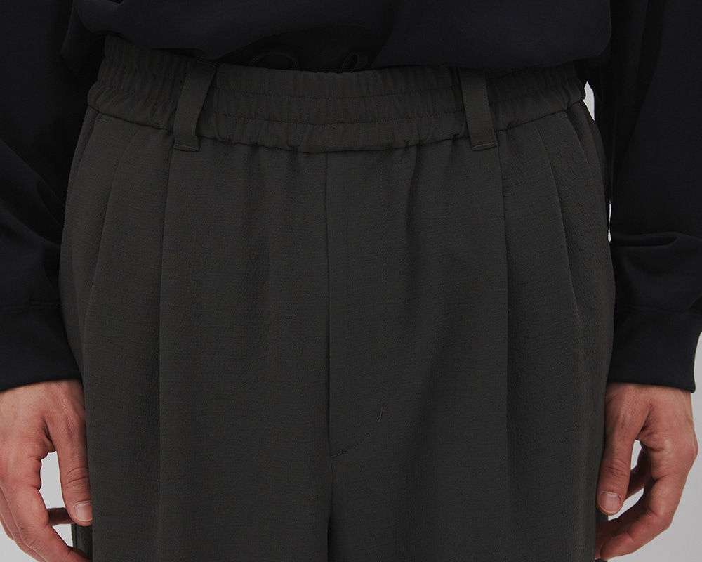 素材の落ち感を活かし、体形を選びにくいバランスに設計しています。ウエストはゴムとコードのイージー仕様。フロントは2タック入りで立体感をプラス。