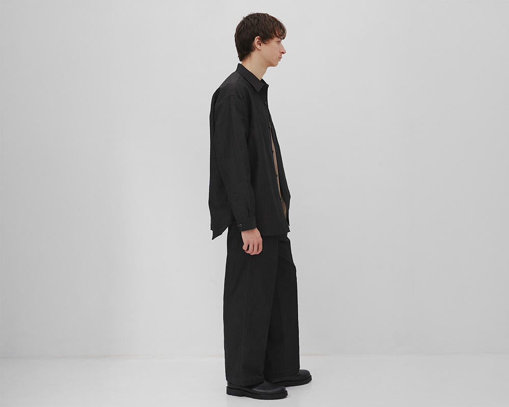 立体的なワイドシルエットに、センタークリースを入れることで、カジュアルにも品よく成立するバランスに仕上げています。同素材シャツとのセットアップはもちろん、Tシャツやニットなどシンプルなトップスでも素材の表情が効き、