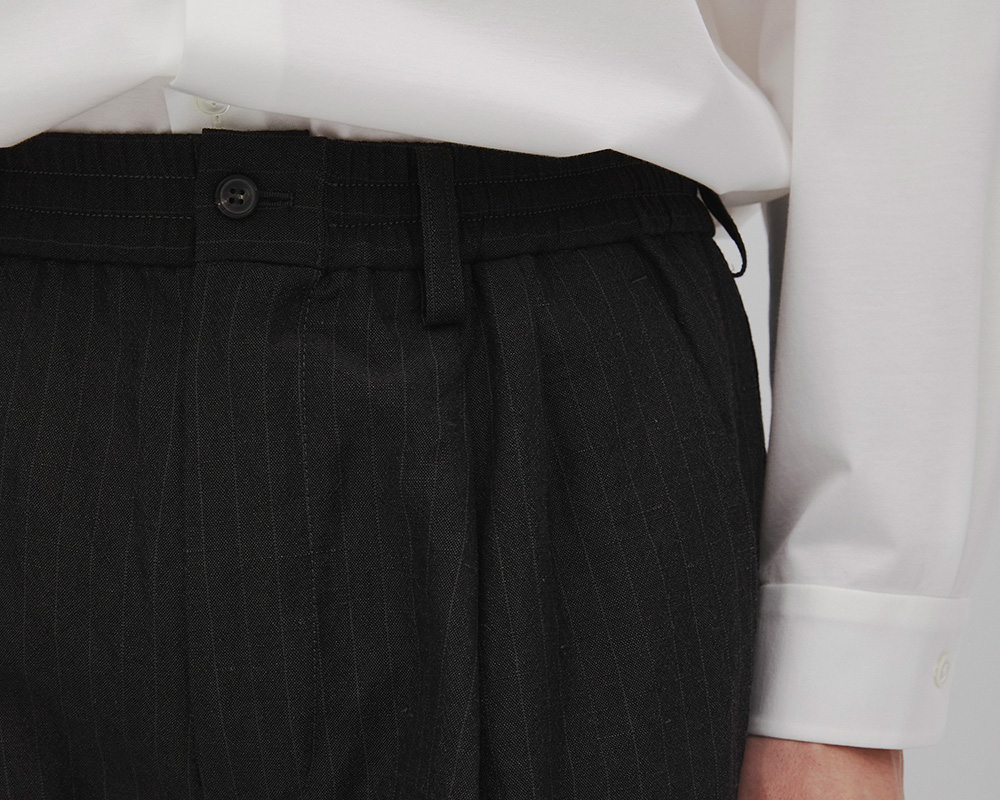 ファスナー開きにすることで、イージーさの中にもきちんと感を残しています。シルエットに奥行きを出すため、深めの2タックを採用。