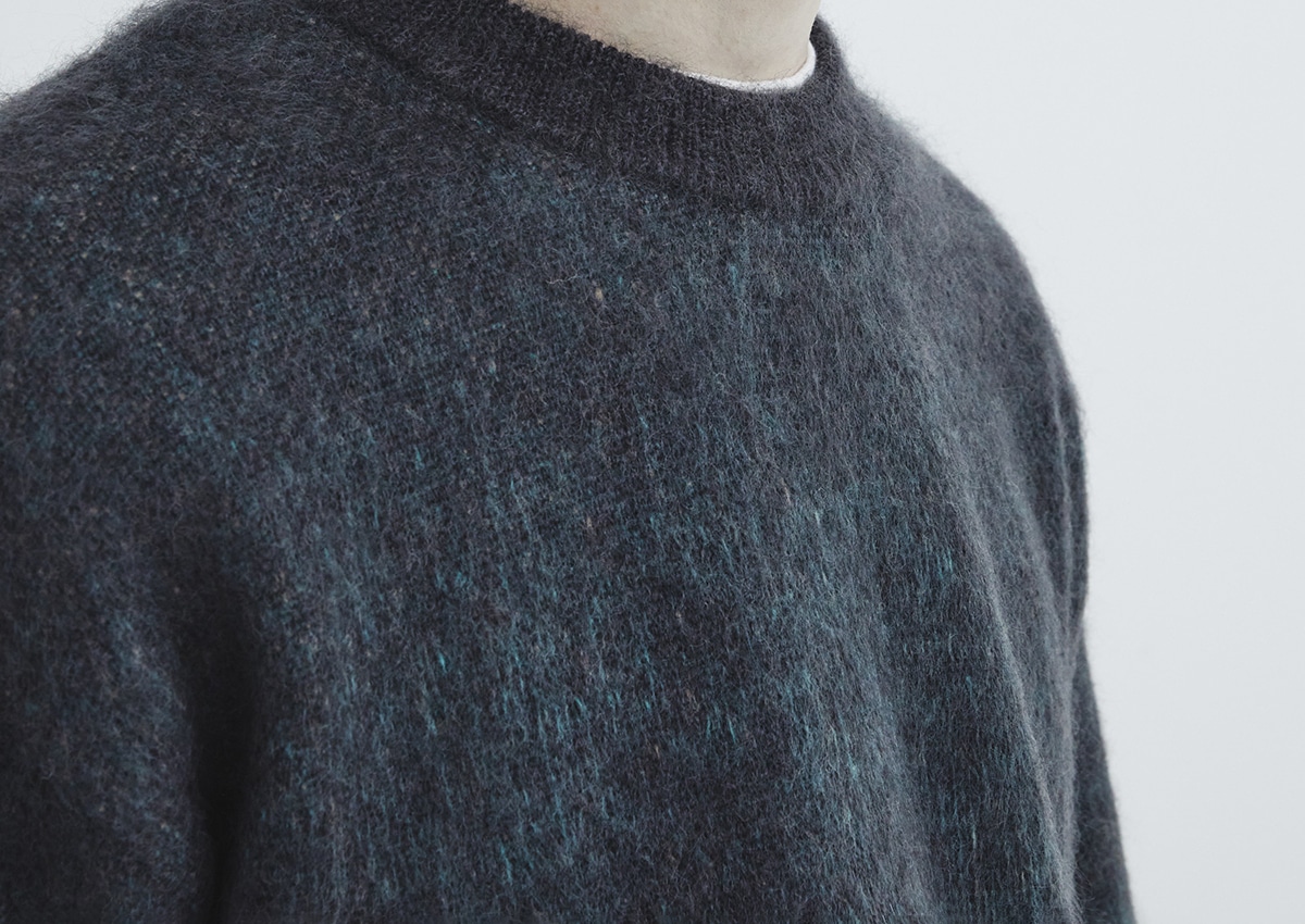 贅沢に数種類のモヘア糸をジャガードで編み立て、シャンブレーのように奥行きのある発色を実現。