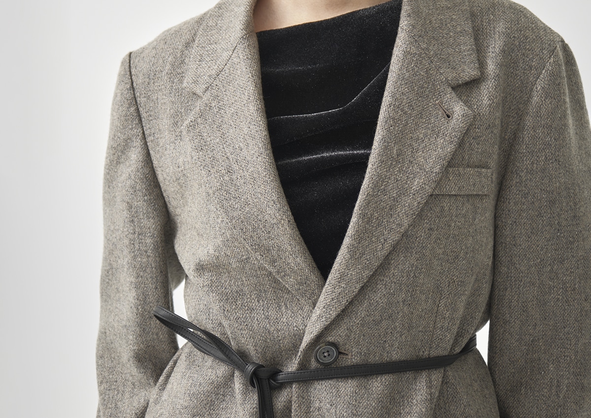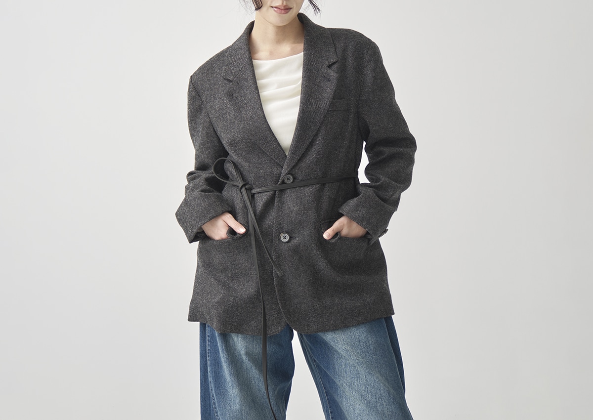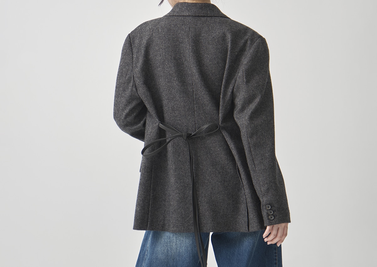 ・マットな質感のレザー紐を付属し、ウエストマークすれば女性らしく、外せばジャケット本来の直線的な印象に。